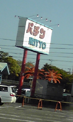 それからフェリーに乗った(もちろん甲板で遊覧船妄想をするのを忘れない)のですが、降りた先にあったパチンコ屋の看板の文字の一部がとれてしまっていたのが妙に面白くてケータイで写真をぱちり。